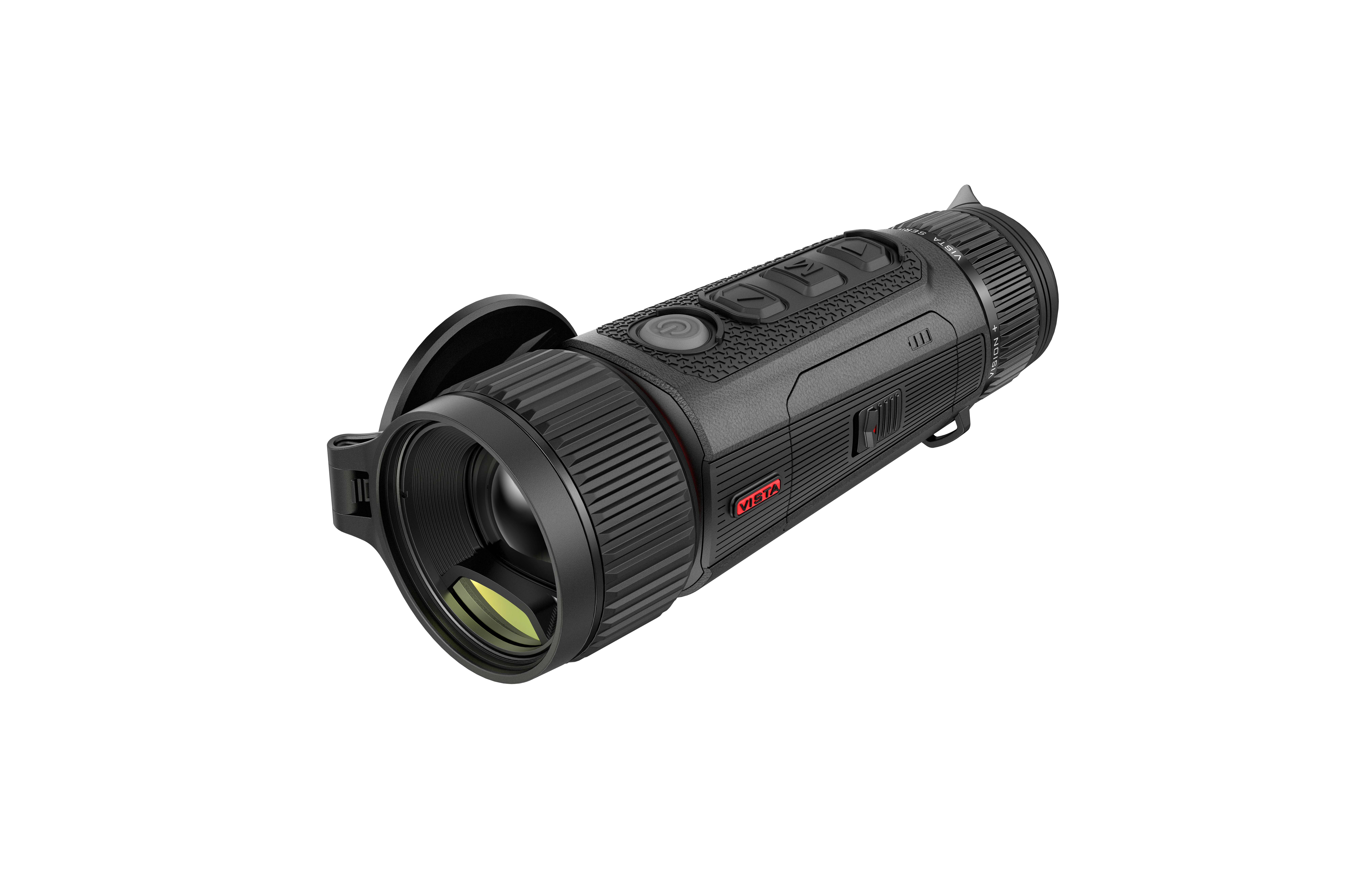 Nocpix:n paras käsikäyttöinen lämpökamera erittäin isolla ja tarkalla pyöreällä näytöllä, 2600m asti yltävällä havainnoinnilla sekä R malleissa integroidulla Range Finder etäisyysmittauksella. Kameran Vision+ järjestelmästä löytyy erittäin tarkka pyöreä 1,03" 2560x2560 AMOLED -näyttö. Pure Vision tilassa saadaan myös valikot piilotettua ja hyödynnettyä koko suuri näyttö katseluun. Poikkeuksellisen hyvä näyttö, kun yhdistetään 8mm ulostulopupilliin ja elektroniseen kuvanvakaimeen, tarjoaa kamera näkyvyyden joka on vertaansa vailla. Ytimenä kamerassa on yrityksen oma kehitteinen NETD sensori, jossa on erittäin herkkä <15mK lämmön erottelu sekä F0.9 linssi, joka mahdollistaa jopa 20% enemmän valoa kuin perinteinen F1.0 linssi. 60Hz ruudunpäivitysnopeus pitää kuvan selkeänä nopeissa tilanteissa ja liikkuvia kohteita katsellessa. Lisäksi Reality+ tekoälyalgoritmi parantaa kuvan tarkkuutta, vähentää värinää ja estää kuvan yli tasoittumista, jolloin saavutetaan poikkeuksellinen tarkkuus, jolla esimerkiksi eläimen turkin kuvio näkyy selkeästi kamerassa. H35R ja H50R malleista löytyy tarkka linssin sisään integroitu 1200m etäisyysmittaus. Kameran mukana on kaksi vaihdettavaa 4400mAh akkupakettia antaa yhteensä 11h käyttöajan. Akut ladattavissa USB-C liittimellä ja niissä on hyvä kylmänkesto antaen jopa 90% käyttöajasta -20°C lämpötilassa. Valittavissa 10 kirkkausvaihtoehtoa sekä seitsemän eri väripalettia. Kaikki ominaisuudet yhdessä päihittää Vista-kamerat kilpailijansa helposti kaikilla osa-alueilla ollen silti hinnallisesti varsin kilpailukykyinen.