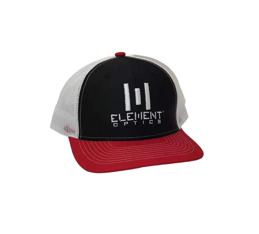 White and red snapback cap featuring the Element Optics logo. - Adjustable snapback closure- One size fits all