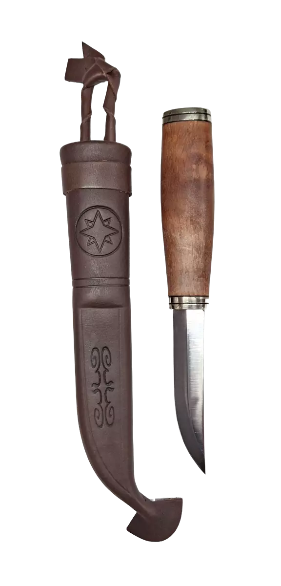 Eräpuu Fisherman 95 Knife, Brown Stained Birch Handle. 95mm blade made of stainless steel. Eräpuu products are high-quality gift items and knives crafted using both machine and handwork. They are also valued and desired gifts. By purchasing our products, you support Finnish artisans and create more jobs in Lapland.