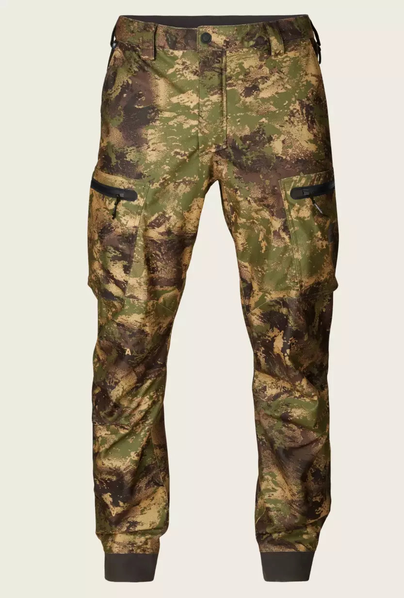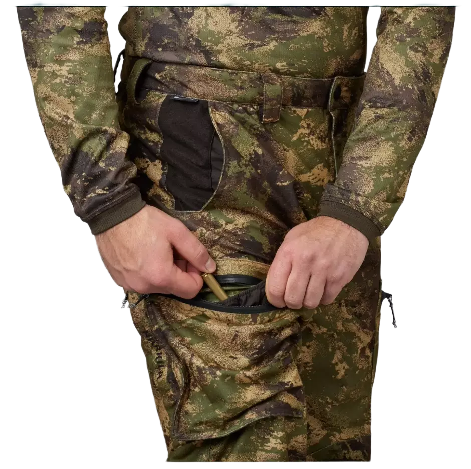 Deer Stalker Camo HWS trousers are made from soft, extremely quiet, and flexible stretch fabric that is treated with DWR to repel dirt and water. Unlike many other membrane trousers, these are ideal for stalking. The built-in HWS® membrane provides complete protection even in heavy rain, with a waterproof rating of 20,000 mm. If your activity level increases and you start to overheat, there are zippered ventilation openings at the back of the thighs to keep you cool. The trousers also feature a moisture-wicking lining. They have our unique AXIS MSP® camo pattern that break up your outlines and allows you to blend into the background. MSP stands for Multi Season Pattern, and as the name suggests, we designed this camouflage pattern to work effectively in various terrains throughout different seasons. It was developed with the assistance of camouflage expert Guy Cramer, who has also designed camouflage patterns for military use in many countries besides AXIS MSP®. The trousers include two large zippered front pockets and a four-cartridge holder on the right thigh. There are adjustment straps behind the knees for an optimal fit. Additionally, there are adjusters at the ankles to ensure a snug fit around your boots. Both ankles also feature a hidden hook for attaching to shoelaces, preventing the trouser legs from riding up while stalking.