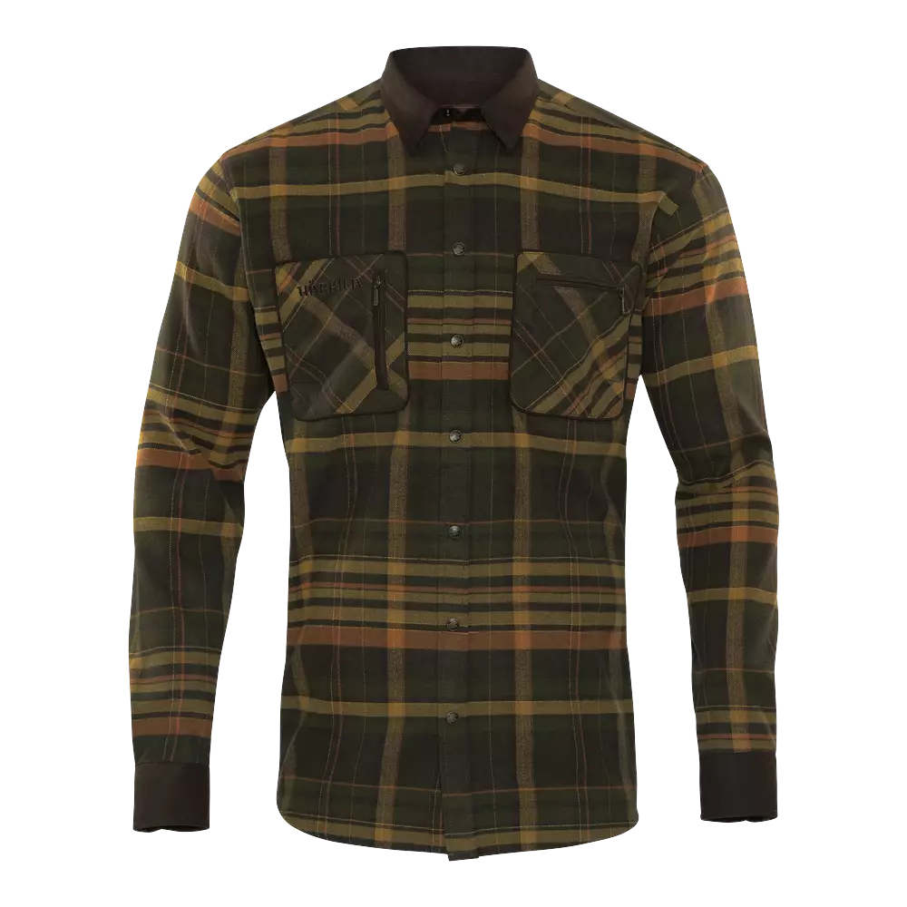 Classic checkered shirt made from 100% cotton. Microfiber reinforcements on the sleeves, elbows, and collar. Features two practical zip pockets and a snap button closure.