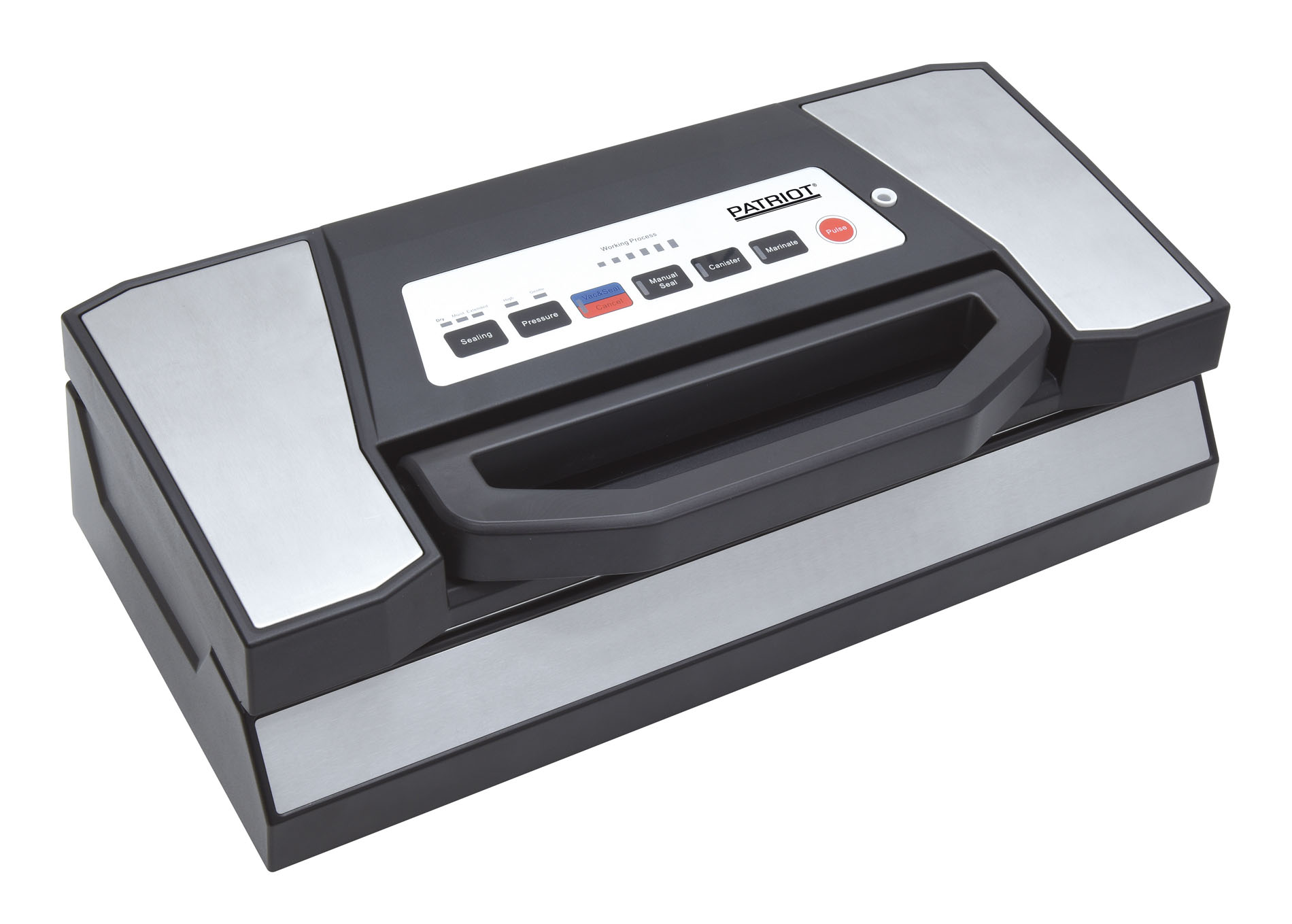 The Patriot vacuum machine is an extremely efficient and easy-to-use device for even the most demanding users. The device's high suction power (-0.9 bar) and double sealing guarantee a successful outcome for almost all food items. The LED-illuminated buttons on the device's lid allow you to select either fully automatic programs or alternatively, the device can be used manually to adjust the suction time precisely for items prone to crushing (berries, fruits, etc.).