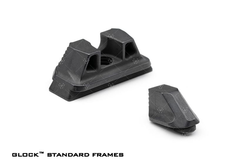 Steel sight set for Glock handguns. Designed to reflect light as effectively as possible, making it easy for the shooter to align the sights accurately.