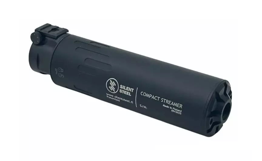 The Silent Steel Compact Streamer is a mid-sized, blow-through silencer designed and manufactured in Finland, specifically developed for demanding use in both law enforcement and recreational applications.