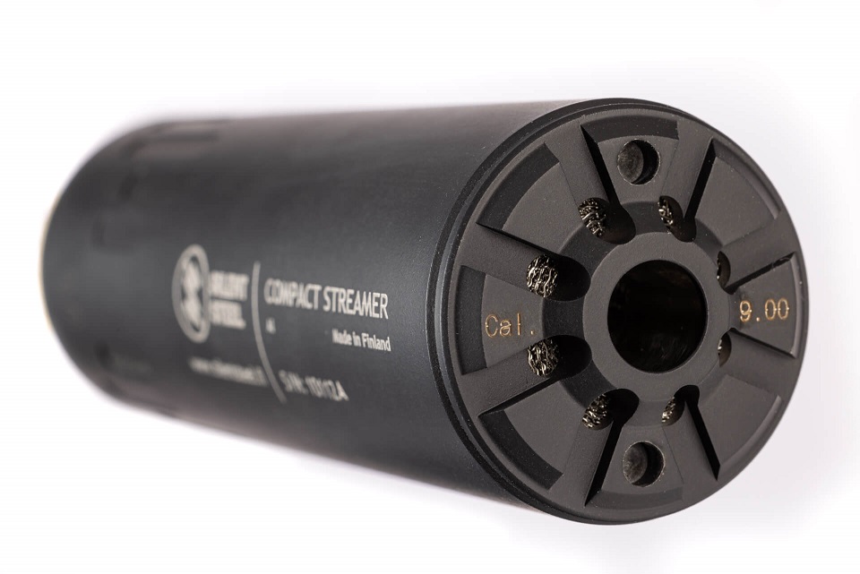 The Compact Streamer is a mid-sized suppressor from Silent Steel. Sound suppression rating: 15-32dB. The suppressor can be disassembled for maintenance. The through-bore design is recommended for gas-operated self-loading rifles. A baffle replacement kit is also available, intended for more traditional single-shot rifles. The suppressor's caliber can be changed by swapping the internal components. Compact Streamer series suppressors effectively eliminate any visible flash from the muzzle and significantly reduce noise levels.