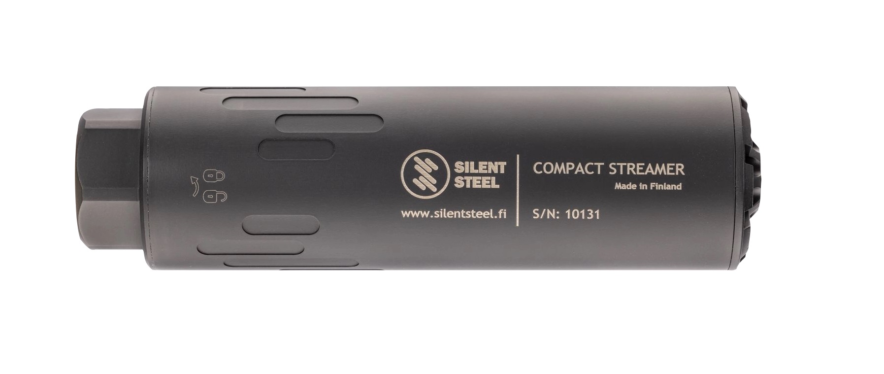 The Compact Streamer is a medium-sized suppressor from Silent Steel. Suppression effectiveness: 15-32dB. The suppressor is disassemblable for maintenance. The pass-through model is recommended for gas-operated self-loading rifles. A baffle swap kit is also available, intended more for single-shot rifles. The suppressor caliber can be changed by swapping the internals. The Compact Streamer series suppressors effectively eliminate all visible muzzle flash and significantly reduce sound.