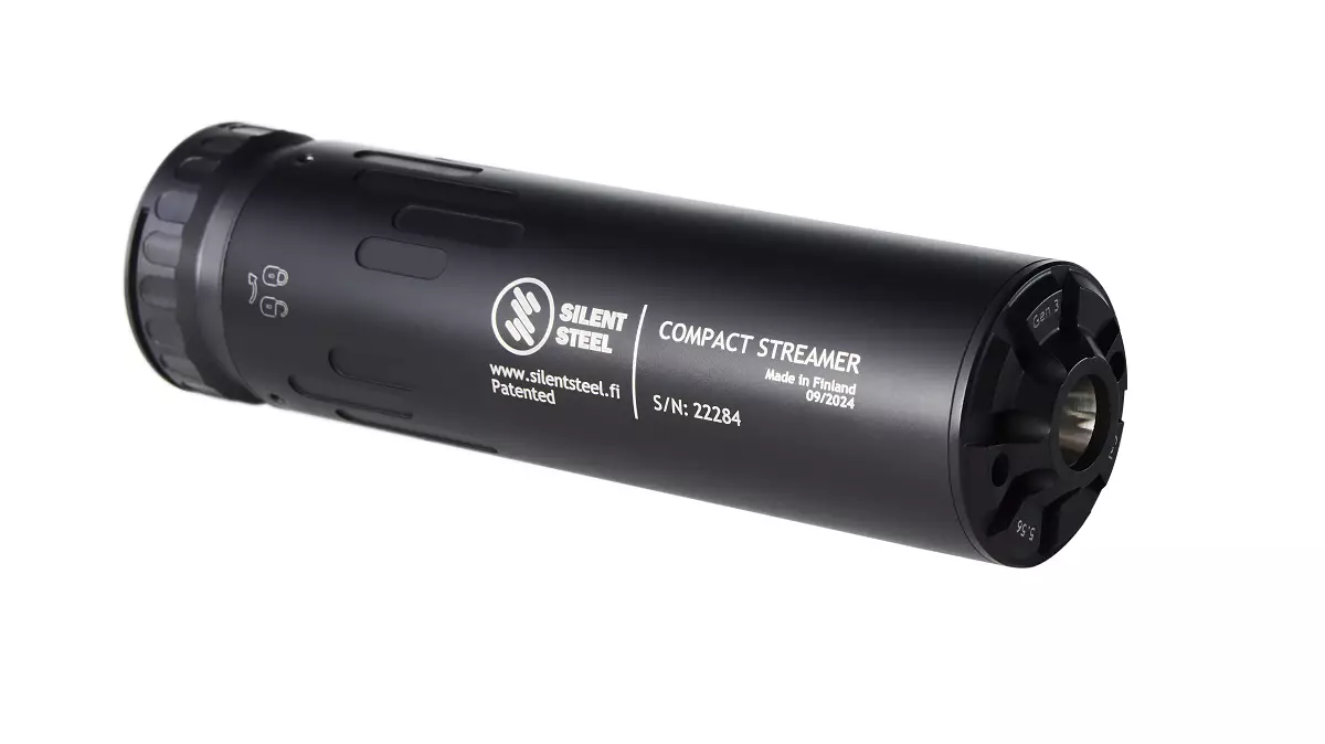 The Silent Steel Compact Streamer is a medium-sized direct-flow sound suppressor designed and manufactured in Finland, developed specifically for demanding use in both official and recreational settings. Its modular and serviceable design makes it a long-lasting and easily maintainable solution for active shooters.