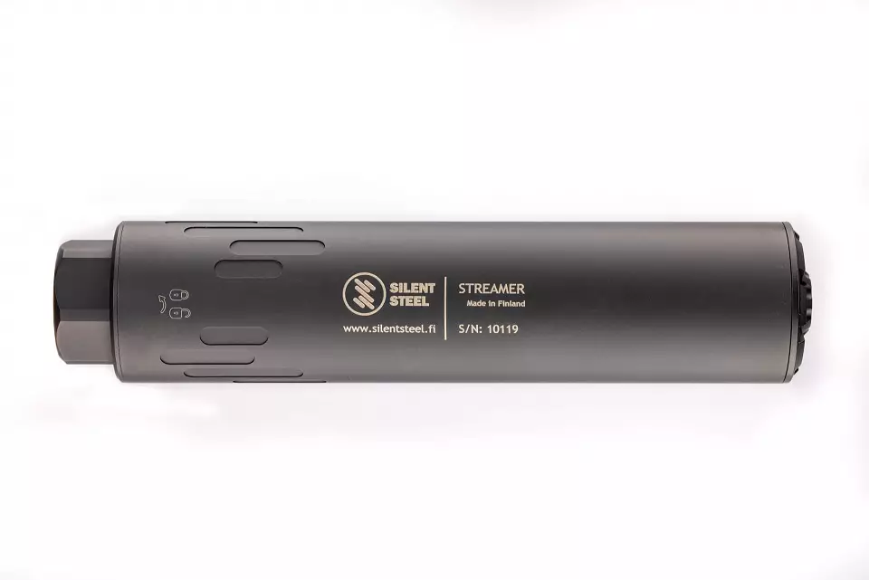 The Streamer is Silent Steel’s full-length suppressor. Suppression efficiency: 15-36dB. The suppressor can be disassembled for maintenance. The through-barrel design is recommended for gas-operated semi-automatic rifles. A baffle replacement kit is also available, intended primarily for single-shot rifles. The baffle (deflector baffle suppressor) is particularly effective for hunting, offering better suppression than through-barrel models. The suppressor’s caliber can also be changed by swapping out the core. The Streamer series effectively eliminates all visible flash from the muzzle and achieves optimal sound reduction.