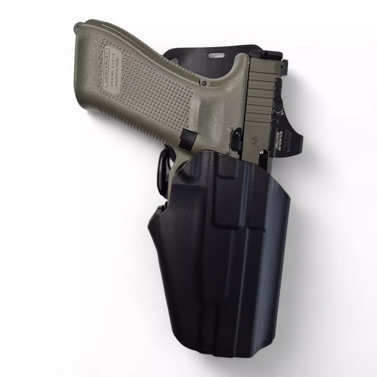 Holster and Mounting: Safariland GLS Pro-Fit & BGS Mid-ride The chosen holster is the Safariland 578 GLS Pro-Fit (Standard). The GLS (Grip Locking System) is an intuitive locking system that releases the firearm when the grip is squeezed during the draw. The lock operates from the trigger guard, ensuring that the threaded barrel or optics do not interfere with holstering.