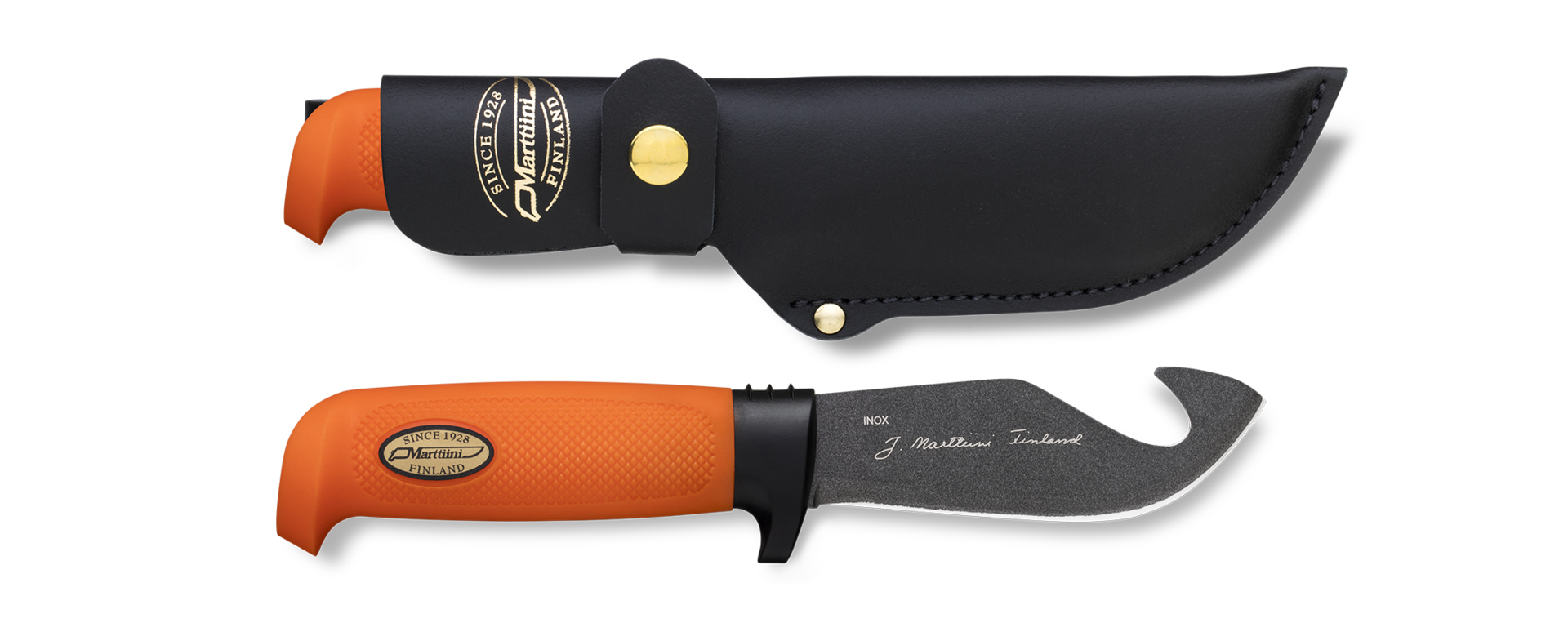 The skinning hook is an excellent aid for opening and skinning game animals. The hook on the blunt side allows for easy opening of the animal, and the round blade design ensures that the hide comes off intact and cleanly. Sharpening the hook can be done with a tapered sharpener (e.g., Marttiini diamond sharpener).