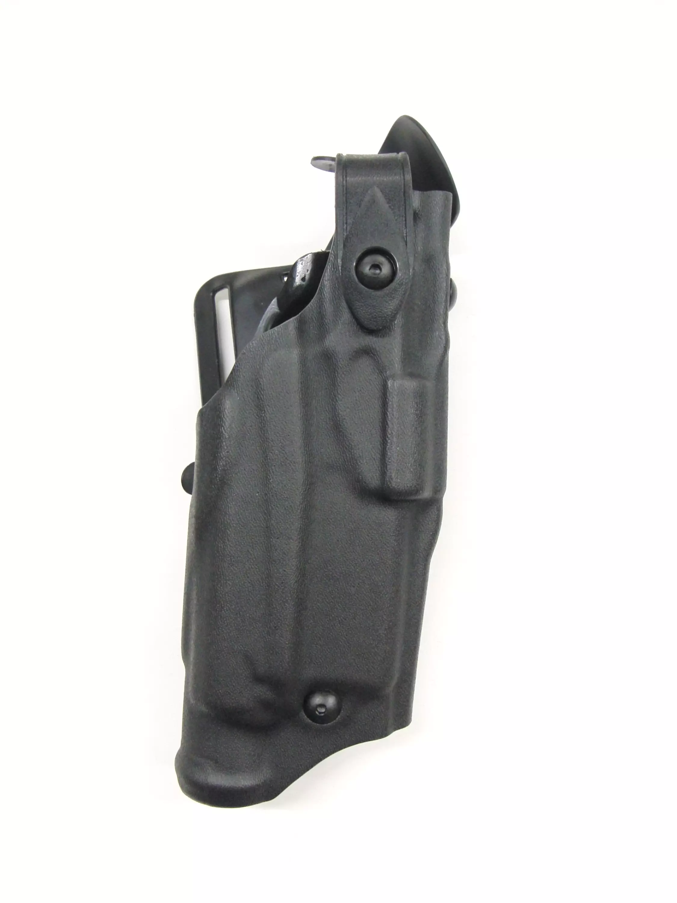Safariland 6360 holsters feature dual locking mechanisms: Self Locking System (SLS) and Automatic Locking System (ALS), making it a Level 3 holster. (The holster's lock can be disengaged with a simple thumb motion). The retention strap in the holster keeps the firearm upright without a weapon light.