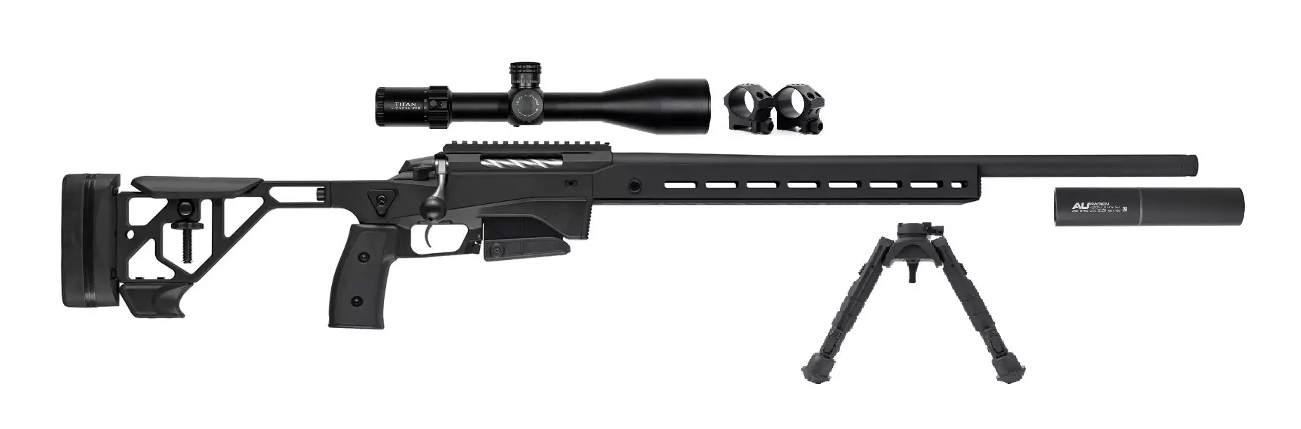 Pakettiin on valittu Element Opticsin Titan-kiikaritähtäin, joka tarjoaa laajan suurennusalueen ja kirkkaan ED-lasin. Kokonaisuuden viimeistelevät kotimainen Ase Utra -vaimennin lämpösuojalla, vakaa 360-asteinen bipodi sekä laadukkaat asennustarvikkeet. Tämä paketti on valmis suoraan radalle vaativiin laukauksiin.