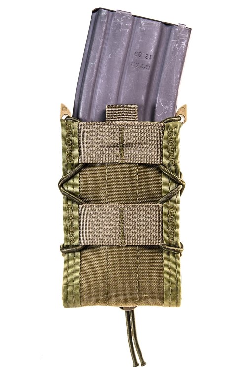Polymeerireuna estää tämän täysin ja lipas liukuu taskusta ulos sulavan tasaisesti. Vaikka lipas tulee hyvin taskusta ulos on tasku kuitenkin istuvuudeltaan napakka eikä välystä ole niin kuin monesti AK- ja RK-avotaskuissa. Taskuun sopii myös sirot .223 / 5.56mm - sekä lihavat .308-lippaat, joten samaa kantolaitetta voi käyttää TACOjen ansiosta lähes kaikkien aseiden kanssa. Heckler & Kochin omat G36 lippaat eivät toimi TACOn kanssa lippaan moninaisista ulokkeista johtuen, mutta Magpul 36G lippailla tätä ongelmaa ei ole. Mikäli lisäretentiolle on tarvetta esim. laskuvarjohyppyjä tai muuta vaativaa toimintaa varten, onnistuu se lisäämällä taskuun varmistuslenkki tai liimaamalla lippaaseen pieni pala koukkupuolen tarraa, joka tarttuu taskun sisällä sijaitsevaan vastapuoleen. Tarran kokoa säätämällä vastuksen voimaan voidaan vaikuttaa.