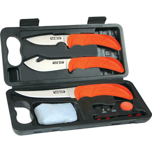 boning knife, two-stage fine ceramic/coarse carbide sharpener, game cleaning gloves and hard-side carry case.