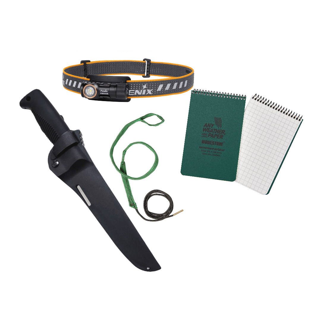 Varustepaketti inttiin, Peltosen Sissipuukko, muistio, boresnake ja otsalamppu