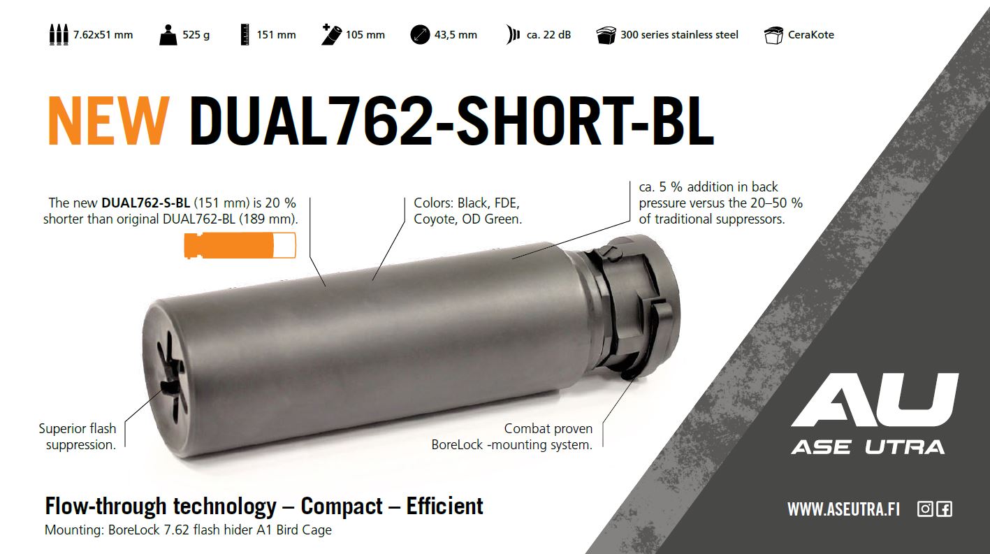 ASE UTRA DUAL 762-SHORT-BoreLock GEN2 Kiväärin äänenvaimennin.