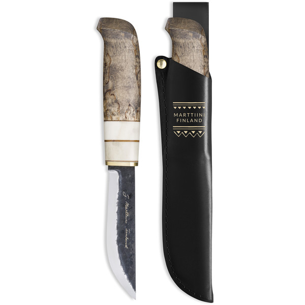 Kahva on maanläheinen yhdistelmä tervan sävyiseksi vahattua visakoivua ja poronsarviluuta.