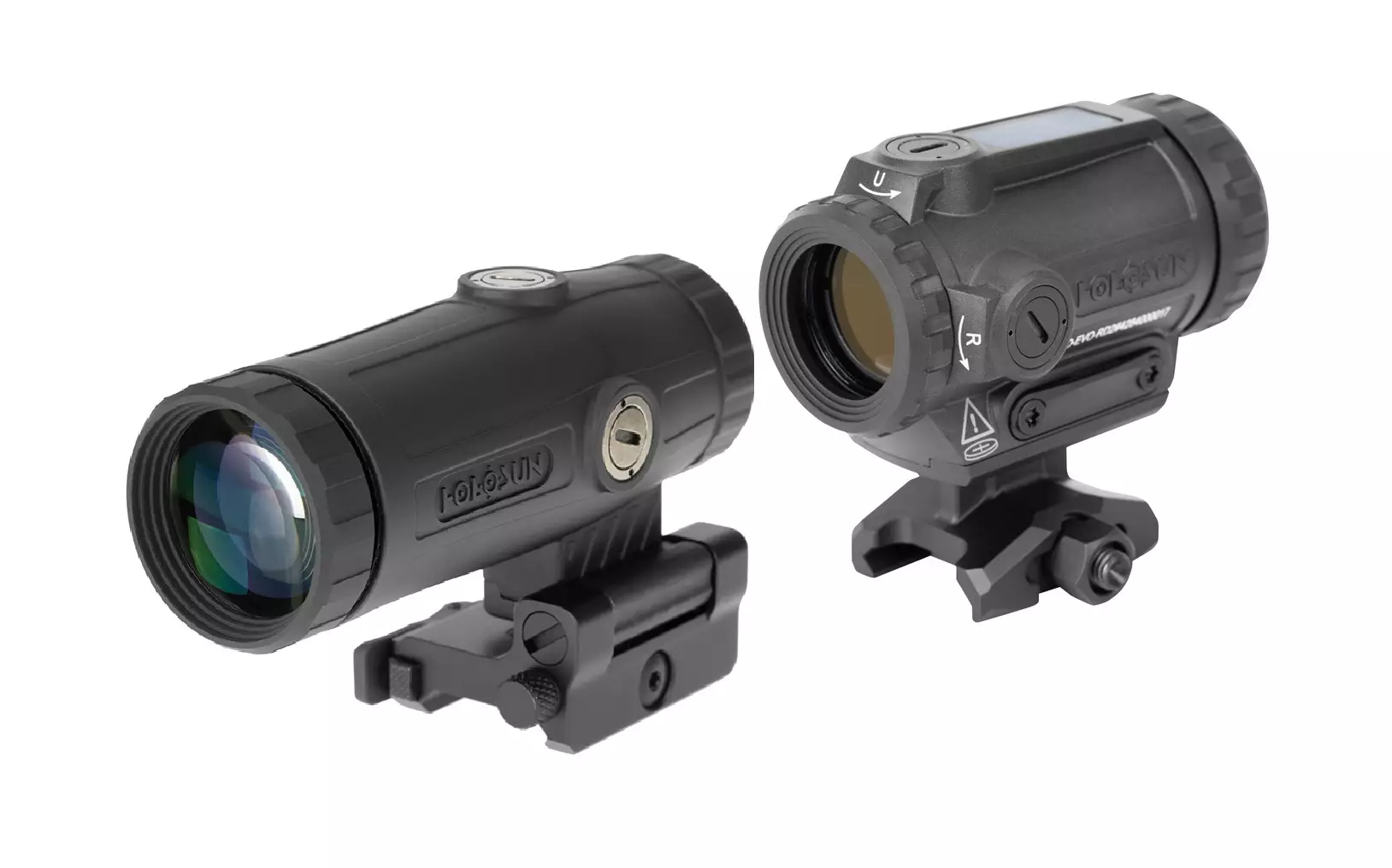 Holosun HM3X suurentaja on tarvittaessa käännettävissä sivuun, jolloin voit käyttää pelkkää punapistetähtäintä ja käyttö onnistuu niin oikea- kuin vasenkätisellekkin.